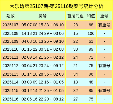 上期前区和值为75,无重号,无连号,首尾间距为27。 大乐透近十期奖号数据统计