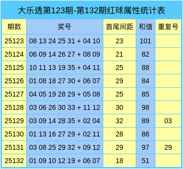 该期前区首尾间距:18,属于低位间距;和值:51,属于:小和值;上期无重号。 第25133期大乐透特征数据统计分析